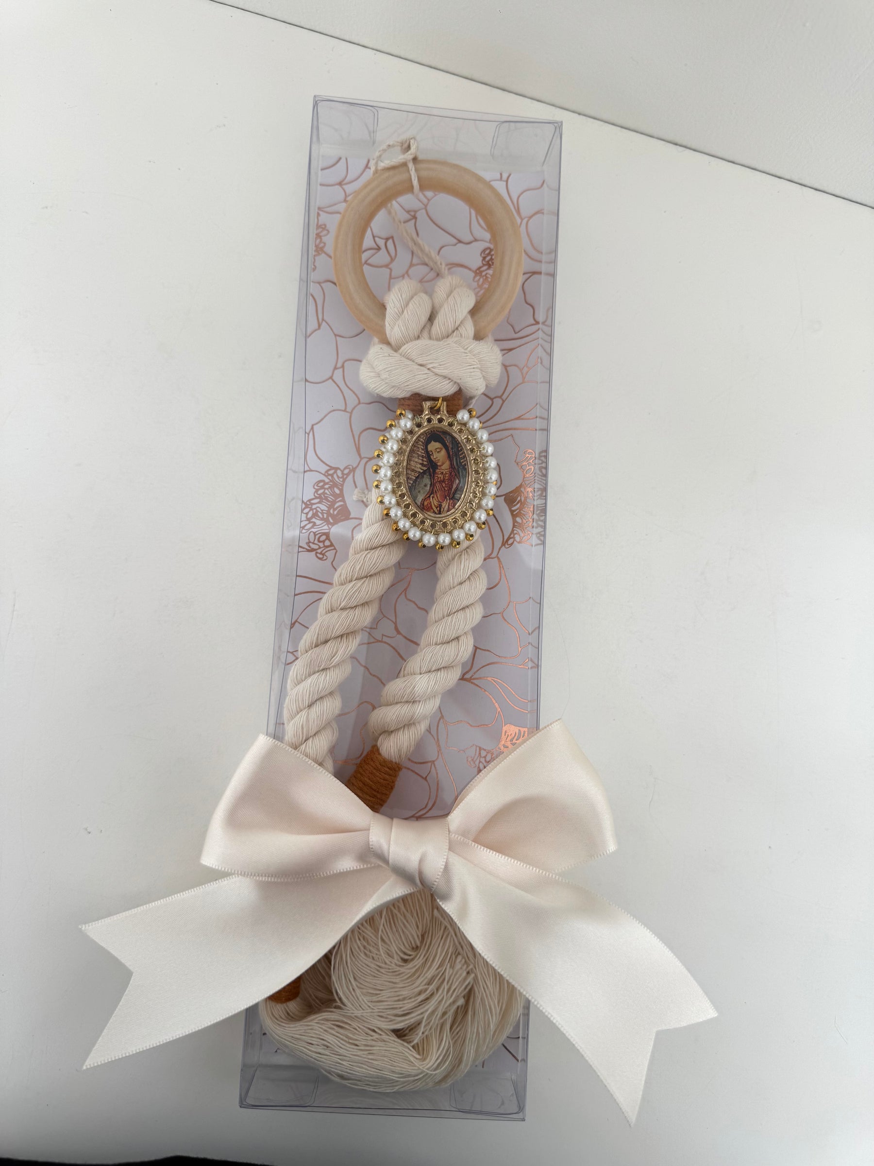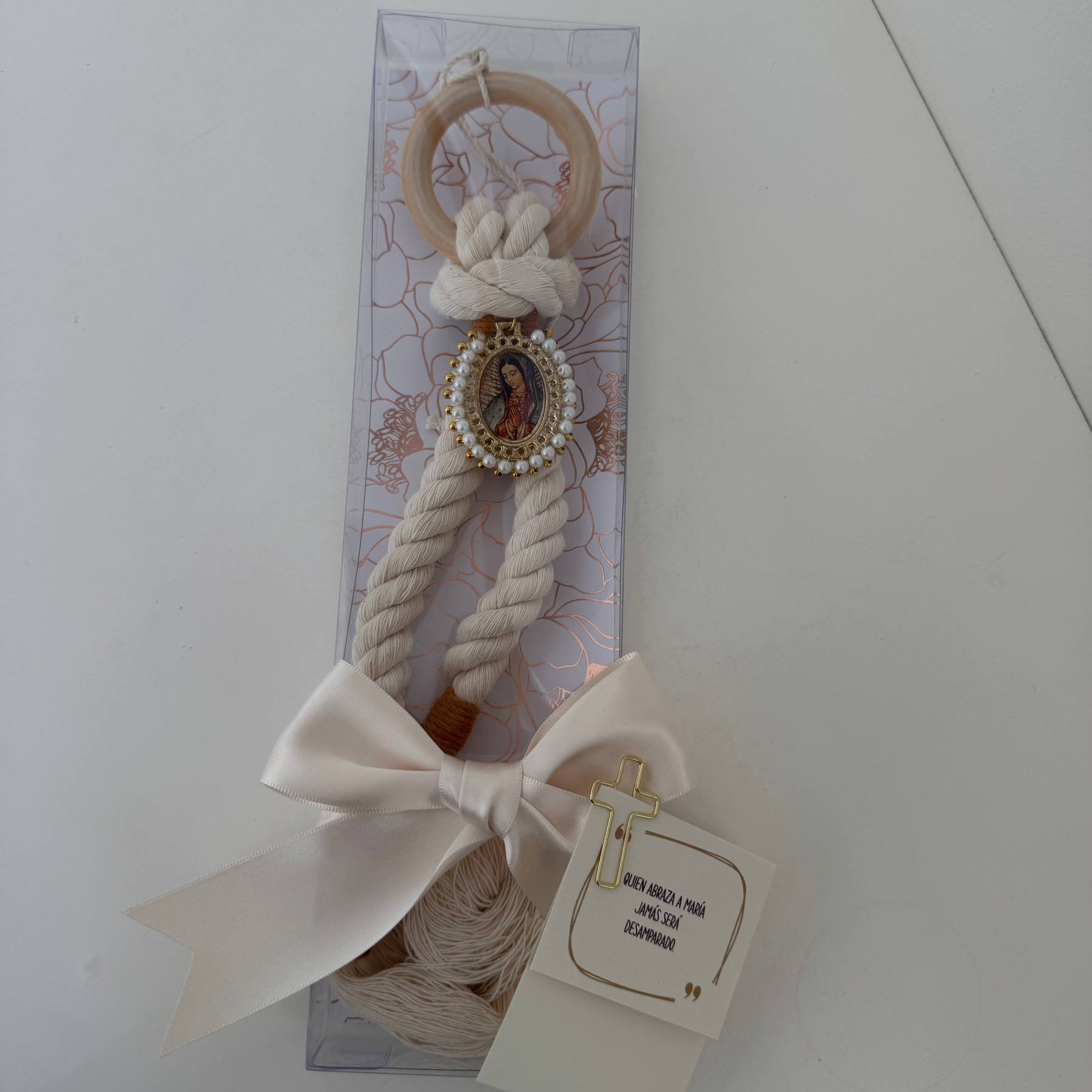 Hermosa bendición para la familia con medalla con imagen de Virgen de Guadalupe.